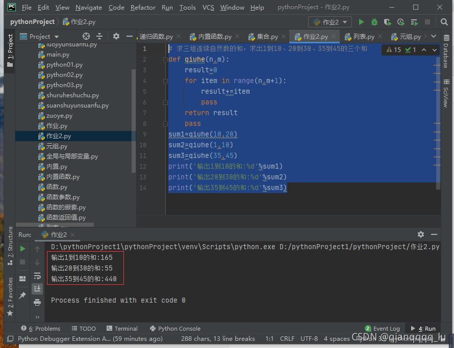 # 求三組連續(xù)自然數(shù)的和,求出1到10、20到30、35到45的三個和