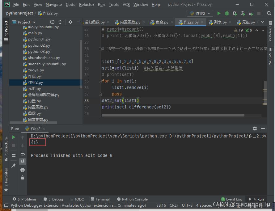 # 指定一個列表,列表中含有唯一一個只出現(xiàn)過一次的數(shù)字,寫程序找出這個獨一無二的數(shù)字 list1=[1,2,3,4,5,6,7,8,2,3,4,5,6,7,8] set1=set(list1) #轉(zhuǎn)為集合,去除重復(fù) # print(set1) for i in set1: list1.remove(i) pass set2=set(list1) print(set1.difference(set2))