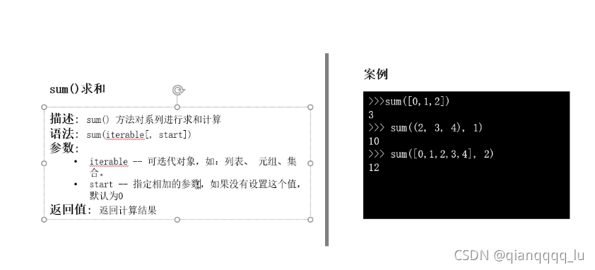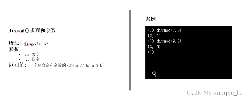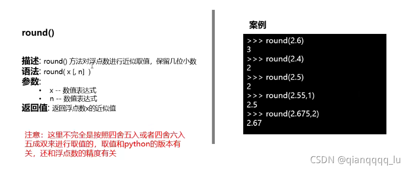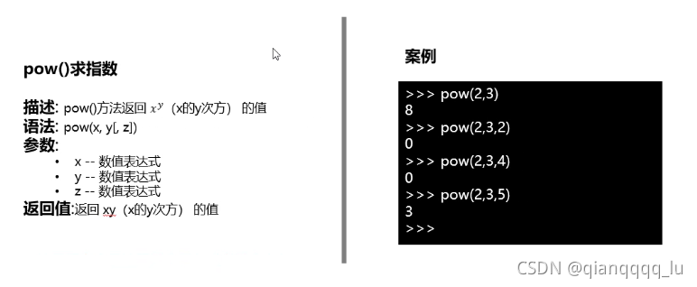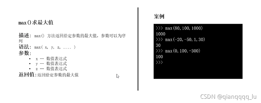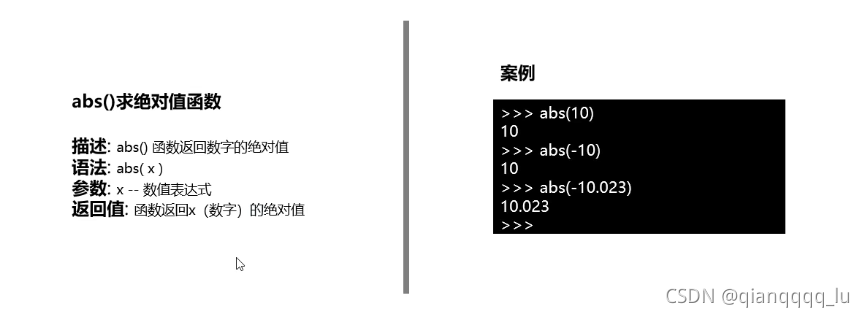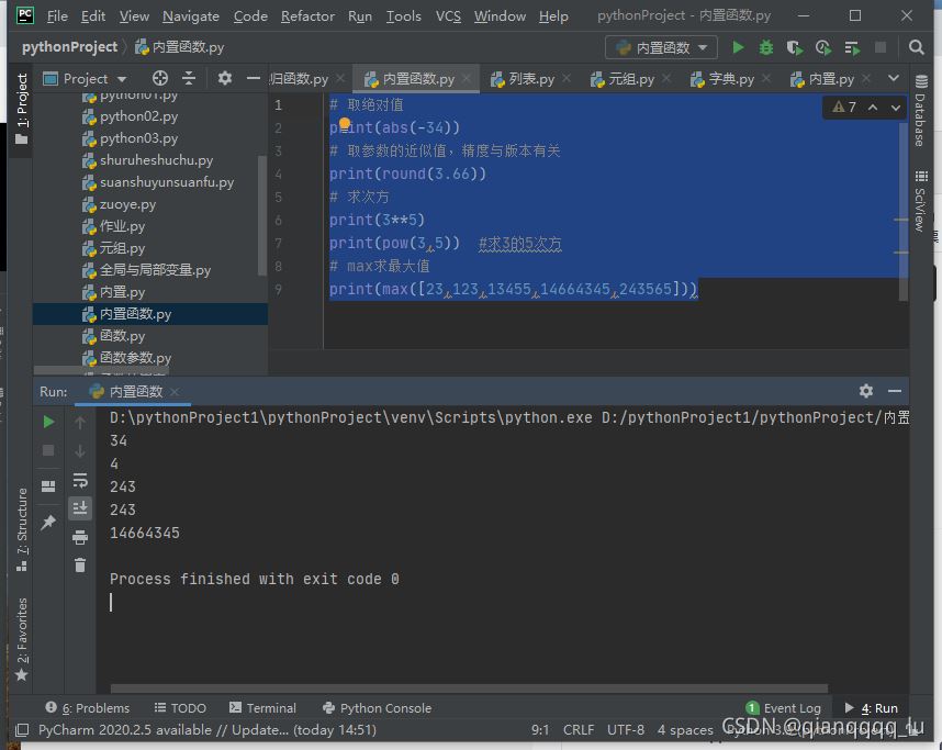 # 取絕對值 print(abs(-34)) # 取參數(shù)的近似值,精度與版本有關(guān) print(round(3.66)) # 求次方 print(3**5) print(pow(3,5)) #求3的5次方 # max求最大值 print(max([23,123,13455,14664345,243565]))