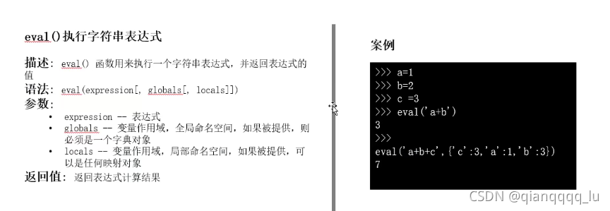 print('動態(tài)執(zhí)行的函數(shù){}'.format(eval('a+b+c'))) #可以調(diào)用函數(shù)執(zhí)行