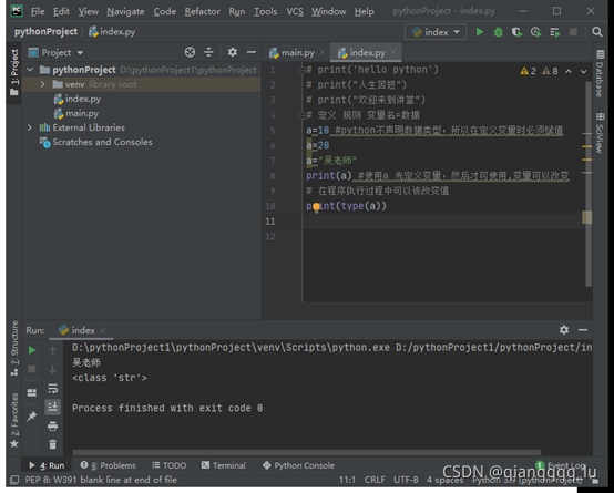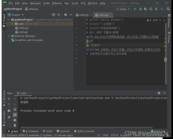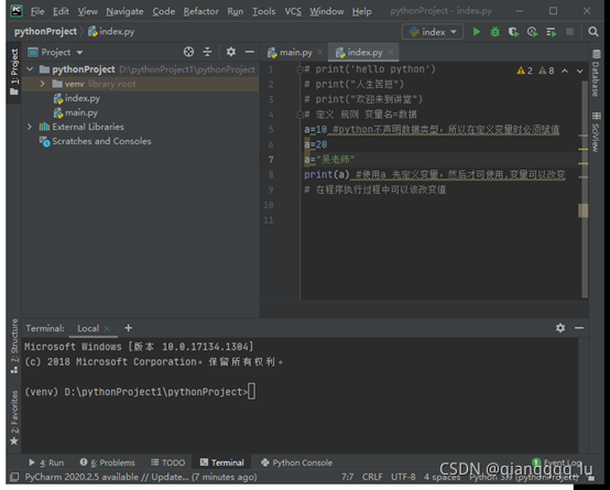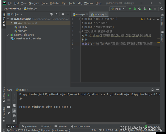 a=10 #python不聲明數(shù)據(jù)類型,所以在定義變量時(shí)必須賦值 a=20 print(a) #使用a 先定義變量,然后才可使用,變量可以改變 # 在程序執(zhí)行過程中可以該改變值
