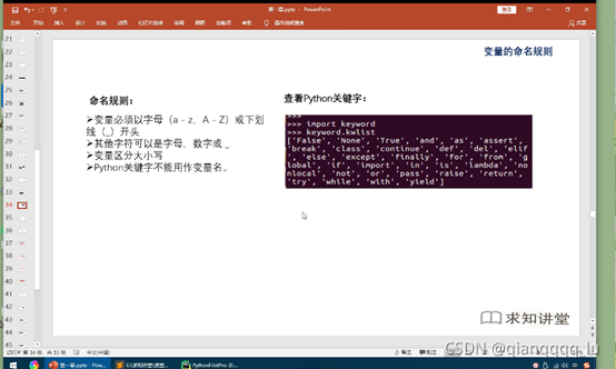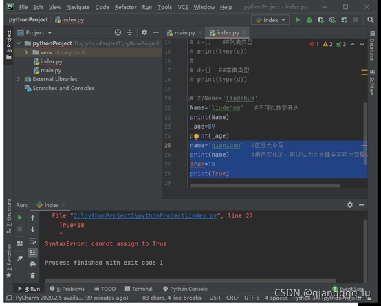 name='qianiqan' #區(qū)分大小寫 print(name)#顏色變化的,可以認(rèn)為為關(guān)鍵字不可為變量名 True=10 print(True)