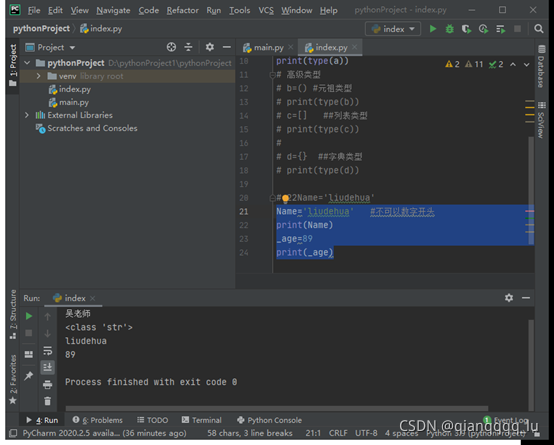 Name='liudehua'#不可以數(shù)字開頭 print(Name) _age=89 print(_age)