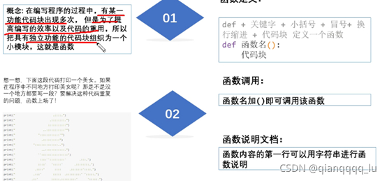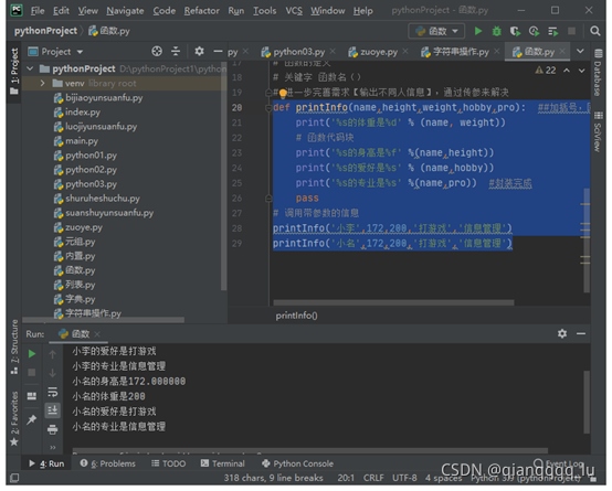# 什么是函數:一系列python語句的組合,可以在程序中運行一次或者多次 # 一般是完成具體的獨立的功能 # 為什么要使用函數 # 代碼的復用最大化以及最小化冗余代碼,整體代碼結構清晰,問題局部化 # 函數定義: # def 函數名() # 函數體【一系列的python語句,表示獨立的功能】 # 函數的調用: #本質上就是去執(zhí)行函數定義里面的代碼塊。在調用函數之前,必須先定義 printInfo() #函數的調用 函數名()#函數的調用
