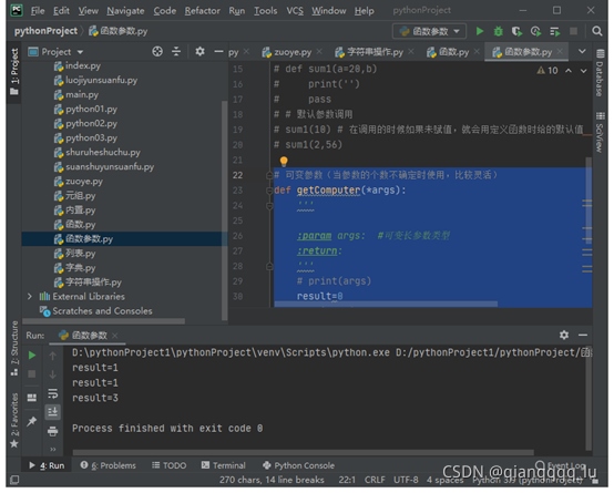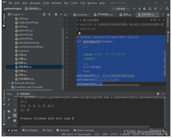 # 可變參數(當參數的個數不確定時使用,比較靈活) def getComputer(*args): ''' :param args: #可變長參數類型 :return: ''' print(args) pass getComputer(1) ##當元組數據時直接加逗號 getComputer((1,2,3,4,5,6)) getComputer(1,2)