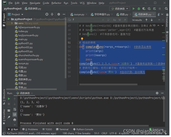 # 組合的使用 def complexFunc(*args,**kwargs): #參數混合使用 print(args) print(kwargs) pass complexFunc(1,2,3,4,name='劉德華') #直接傳送到第一個參數之中 # 參數可以都給,也可以都不給,也可以只給其一 complexFunc(name='賈玲') #自動識別,自動填充