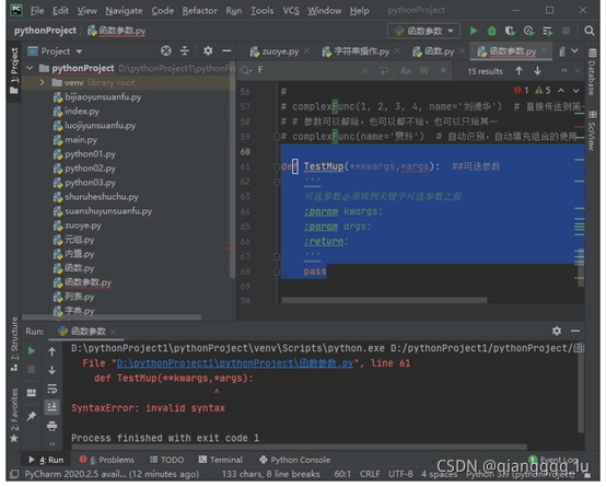 def TestMup(**kwargs,*args): ##可選參數 ''' 可選參數必須放到關鍵字可選參數之前 可選參數:接受的數據是一個元組類型 關鍵字可選參數:接受的數據是一個字段類型 :param kwargs: :param args: :return: ''' pass