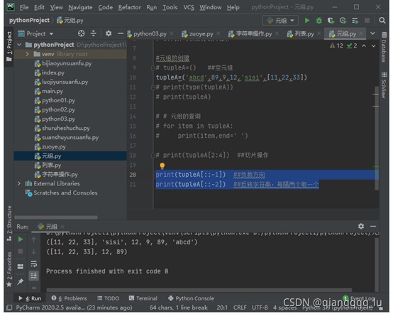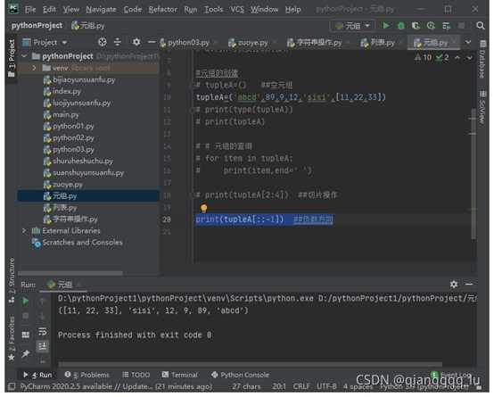 print(tupleA[::-1]) ##負(fù)數(shù)方向 print(tupleA[::-2]) ##反轉(zhuǎn)字符串,每隔兩個(gè)取一個(gè)