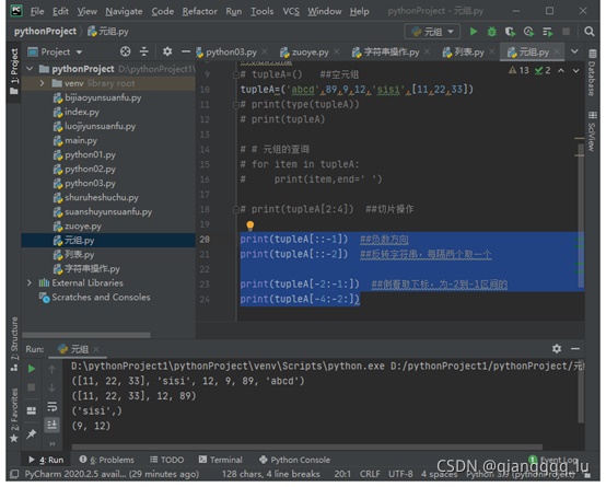 print(tupleA[::-1]) ##負(fù)數(shù)方向 print(tupleA[::-2]) ##反轉(zhuǎn)字符串,每隔兩個(gè)取一個(gè) print(tupleA[-2:-1:]) ##倒著取下標(biāo),為-2到-1區(qū)間的 print(tupleA[-4:-2:])