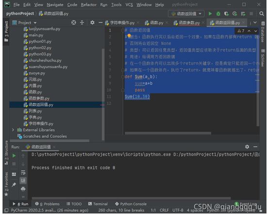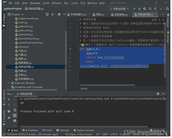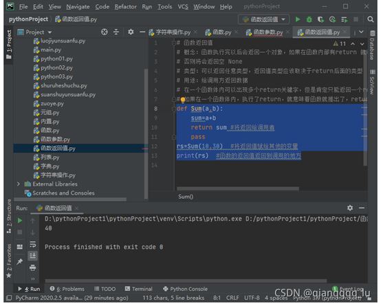 def Sum(a,b): sum=a+b return sum #將返回給調(diào)用者 pass print(Sum(10,30)) #函數(shù)的返回值返回到調(diào)用的地方