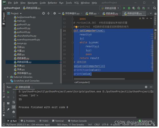 def calComputer(num): result=0 i=1 while i<=num: result+=i i+=1 pass return result # 調(diào)用函數(shù) value=calComputer(10) print(type(value)) print(value)