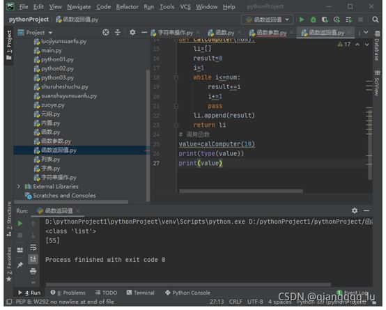def calComputer(num): li=[] result=0 i=1 while i<=num: result+=i i+=1 pass li.append(result) return li # 調(diào)用函數(shù) value=calComputer(10) print(type(value)) print(value)