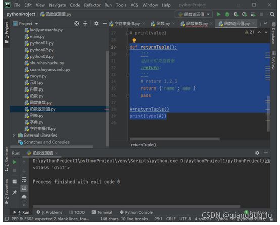 # 函數(shù)返回值 # 概念:函數(shù)執(zhí)行完以后會返回一個對象,如果在函數(shù)內(nèi)部有return 就可以返回實際值, # 否則將會返回空 None # 類型:可以返回任意類型,返回值類型應(yīng)該取決于return后面的類型 # 用途:給調(diào)用方返回數(shù)據(jù) # 在一個函數(shù)體內(nèi)可以出現(xiàn)多個return關(guān)鍵字,但是肯定只能返回一個return關(guān)鍵字 # 如果在一個函數(shù)體內(nèi),執(zhí)行了return,就意味著函數(shù)就推出了,return后面的代碼語句將不會執(zhí)行 def Sum(a,b): sum=a+b pass Sum(10,30)