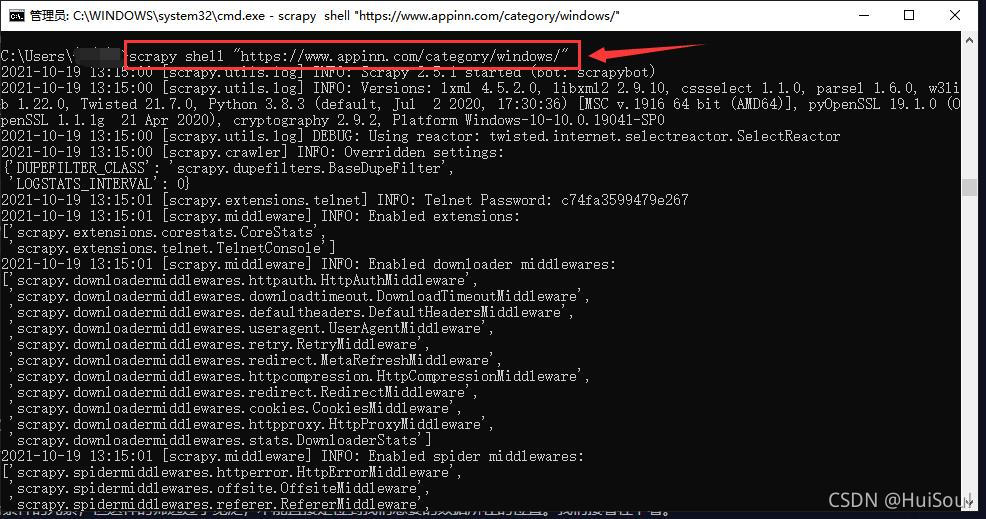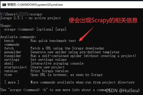 然后,我們?cè)诿钚猩锨蒙?mark>scrapy,便會(huì)顯示scrapy的信息,這樣就代表安裝成功啦!