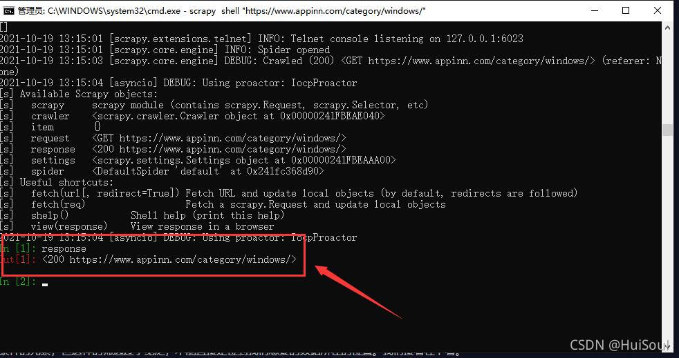 這時(shí) Scrapy 已經(jīng)訪問了這個(gè)鏈接,并把獲取到的結(jié)果記錄了下來(lái),你會(huì)進(jìn)入到一個(gè)交互環(huán)境,我們可以在這個(gè)環(huán)境里寫代碼并一句一句執(zhí)行。輸入 response 并回車,你能看見類似下面的響應(yīng),這就是上面獲取到的網(wǎng)頁(yè)結(jié)果。