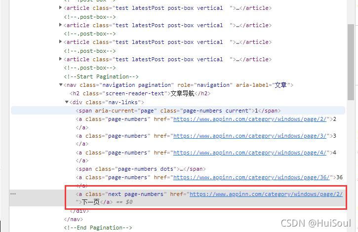 注意截圖中被框住的部分,瀏覽器已經(jīng)展示出來(lái)這個(gè)按鈕的 CSS 選擇方法是什么了。它告訴我們下一頁(yè)按鈕的選擇方式是a.next.page-numbers。