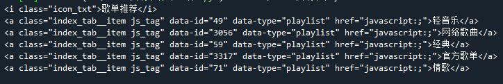 同樣的,我們發(fā)現(xiàn)這幾個(gè)主題都在 class="index_tab__item js_tag"的 a標(biāo)簽下,這時(shí)為了避免篩選到源代碼中其他同為class="index_tab__item js_tag"的標(biāo)簽,我們需要再加多一個(gè)條件data-type=“playlist”,具體怎么操作呢?