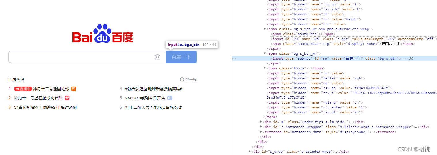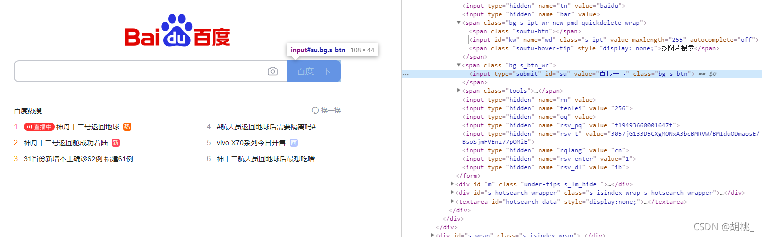 // 搜索百度使用f12定位到按鈕的位置 <input type="submit" id="su" value="百度一下" class="bg s_btn">
