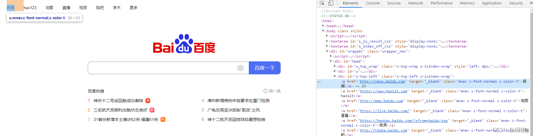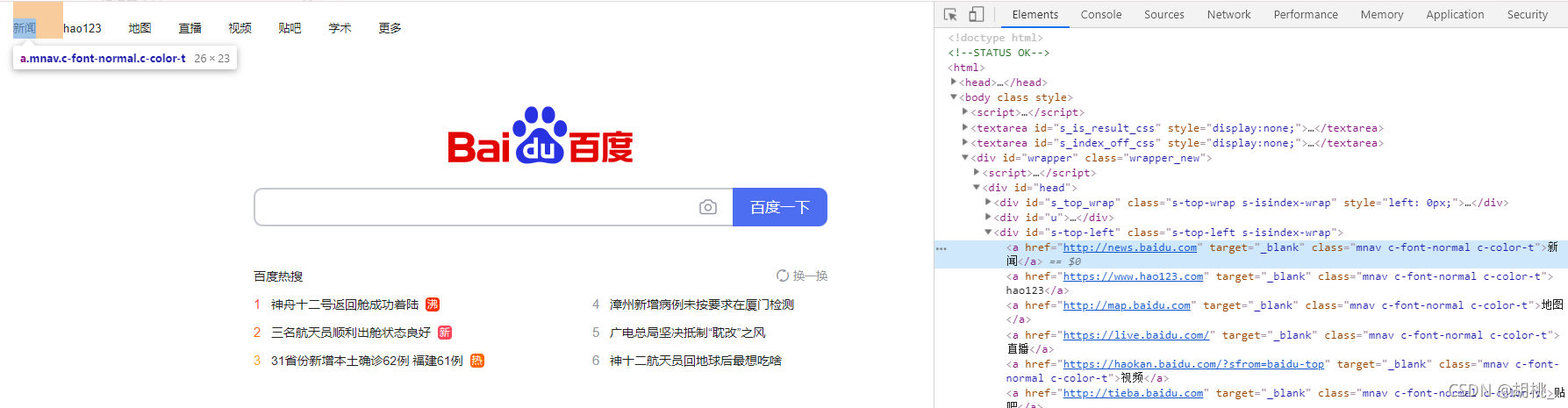 // 搜索百度使用f12定位到按鈕的位置 <a rel="external nofollow" rel="external nofollow" target="_blank" class="mnav c-font-normal c-color-t">新聞</a>