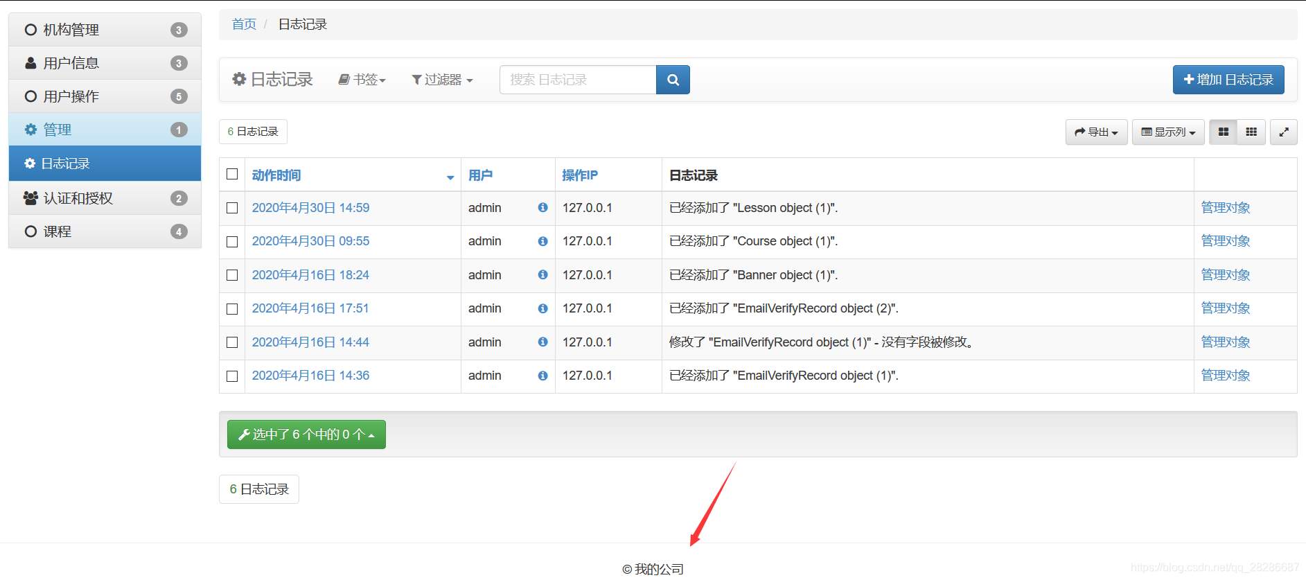 import xadmin from .models import EmailVerifyRecord,Banner from xadmin import views class BaseSetting(object): enable_themes = True use_bootswatch = True class GlobalSettings(object): site_title = '慕學(xué)后臺管理系統(tǒng)' site_footer = '慕學(xué)在線網(wǎng)' menu_style = 'accordion' class EmailVerifyRecordAdmin(object): # 列表顯示的字段 list_display = ['code','email','send_type','send_time'] # 搜索字段 # search_fields = ['code','email'] # 搜索字段 list_filter = ['code','email','send_type','send_time'] class BannerAdmin(object): # title = models.CharField(max_length=100, verbose_name=u"標(biāo)題") # image = models.ImageField(max_length=100, upload_to="banner/%Y/%m", verbose_name=u"輪播圖") # url = models.URLField(max_length=100, verbose_name=u"訪問地址") # index = models.IntegerField(verbose_name=u"順序", default=100) # add_time = models.DateTimeField(default=datetime.now, verbose_name=u"添加時間") list_display = ['title', 'url', 'index', 'add_time'] xadmin.site.register(EmailVerifyRecord,EmailVerifyRecordAdmin) xadmin.site.register(Banner,BannerAdmin) xadmin.site.register(views.BaseAdminView,BaseSetting) xadmin.site.register(views.CommAdminView,GlobalSettings)