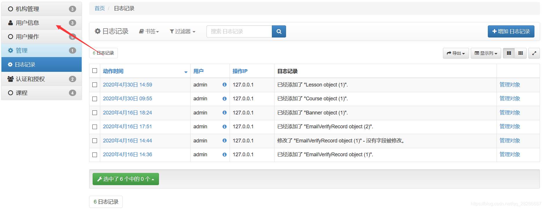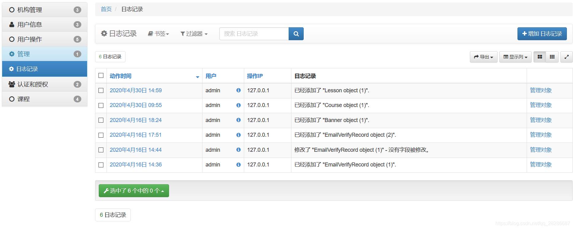 import xadmin from .models import Course,Lesson,Video,CourseResource class CourseAdmin(object): list_display = ['name', 'desc', 'detail', 'degree','learn_time','students','fav_nums','click_nums'] # # 搜索字段 # # search_fields = ['code','email'] # # 搜索字段 # list_filter = ['code', 'email', 'send_type', 'send_time'] class LessonAdmin(object): list_display = ['course', 'name', 'add_time'] # 搜索字段 search_fields = ['course','name','add_time'] list_filter = 'course','name','add_time' class VideoAdmin(object): list_display = ['lesson', 'name', 'add_time'] class CourseResourceAdmin(object): list_display = ['course', 'name', 'download','add_time'] xadmin.site.register(Course,CourseAdmin) xadmin.site.register(Lesson,LessonAdmin) xadmin.site.register(Video,VideoAdmin) xadmin.site.register(CourseResource,CourseResourceAdmin)