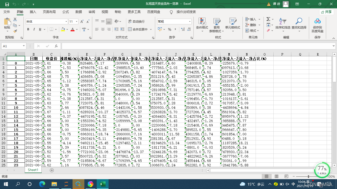 將爬取出的東旭藍(lán)天資金流向數(shù)據(jù)存到excel表中,得到表格的部分截圖如下: