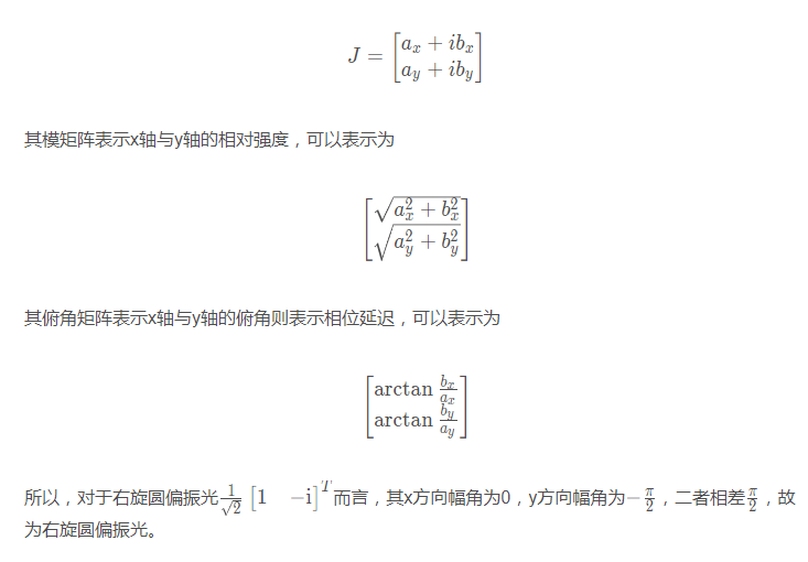 為了對(duì)Jones矩陣所對(duì)應(yīng)的偏振狀態(tài)進(jìn)行繪制,我們需要進(jìn)一步理解Jones矩陣中每個(gè)值所對(duì)應(yīng)的物理概念。如果將Jones矩陣寫(xiě)成虛數(shù)形式,可以表示為