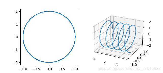 def drawJones(J=[1,-2j]): J = np.array(J).reshape(2,1) # 設(shè)1.064um的光在z方向傳播5um后,沿傳播方向看去的振幅分布 z = np.arange(0,5,0.01) k = 2*np.pi/1.064 # 將J改寫(xiě)成x和y方向的振幅序列 J = np.abs(J)*np.cos(k*z+np.angle(J)) fig = plt.figure() ax1 = fig.add_subplot(121) ax1.plot(J[0],J[1]) ax2 = fig.add_subplot(122,projection='3d') ax2.plot3D(z,J[0],J[1]) plt.show() if __name__ == "__main__": drawJones()