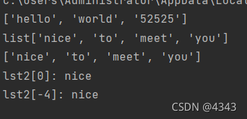 lst = ['hello','world','52525',123,4,2] print(lst) print(lst[0:3]) print(lst[0:4:2])