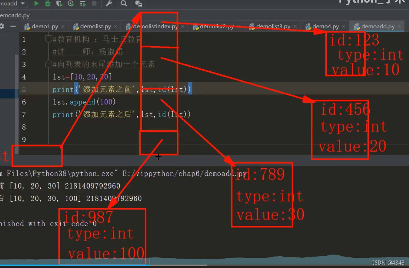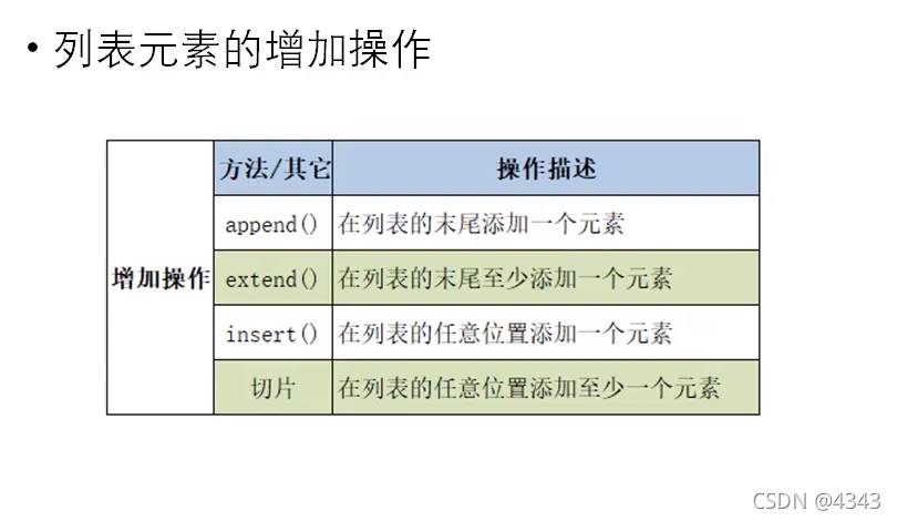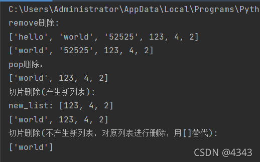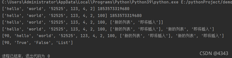 lst = ['hello','world','52525',123,4,2] print(lst,id(lst)) lst.append(100) print(lst,id(lst)) #可以看出地址并沒(méi)有變化 lst1 = ['新的列表','即將插入'] lst.append(lst1) #將lst1作為一個(gè)元素插入在列表lst中(append只能插入一個(gè)元素) print(lst) lst.extend(lst1) #在lst的末尾一次性插入多個(gè)元素 print(lst) lst.insert(0,90) #insert(index,value) print(lst) #切片 lst3 = ['True','False','List'] lst[1:] = lst3 print(lst)