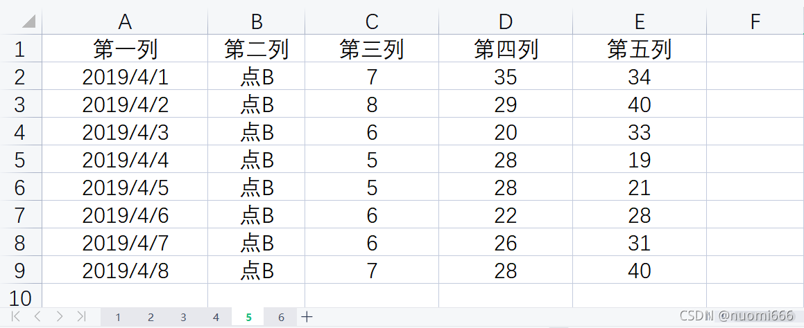 如果不想獲取全部行數(shù),如獲取前5行可以設(shè)置參數(shù)nrows=5,同時(shí)跳過(guò)第2行到第4行,可以設(shè)置參數(shù)skiprows=[i for i in range(2,5)],或者skiprows=[2,3,4],代碼及輸出結(jié)果: