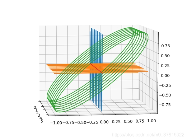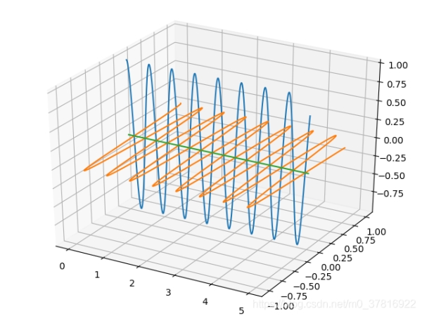 #偏振光演示 import numpy as np import matplotlib.pyplot as plt from mpl_toolkits.mplot3d import Axes3D as axd def polarShow(): z = np.arange(0,5,0.01)#傳播方向,單位um dWave = 0.6328 x1 = z*0 y1 = np.cos(2*np.pi*z/dWave)#此光波偏振方向為y x2 = np.cos(2*np.pi*z/dWave)#此光波偏振方向為y y2 = z*0 fig = plt.figure() ax = axd(fig) ax.plot3D(z,x1,y1) ax.plot3D(z,x2,y2) ax.plot3D(z,x1,y2) plt.show()