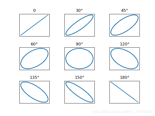 #偏振光演示 def polarShow(dWave = 0.6328): z = np.arange(0,5,0.01) x = np.cos(2*np.pi*z/dWave) #x偏振光 delta = [0,np.pi/6,np.pi/4,\ np.pi/3,np.pi/2,2*np.pi/3,\ 3*np.pi/4,5*np.pi/6,np.pi] titles = ["0","30°","45°","60°","90°",\ "120°","135°","150°","180°"] #fig = plt.figure() for i in range(9): ax =plt.subplot(331+i) #子圖繪制,表示3×3的布局中的第(1+i)個圖 ax.set_title(titles[i]) y = np.cos(2*np.pi*z/dWave+delta[i])#此光波偏振方向為y plt.plot(x,y) plt.xticks([]) plt.yticks([]) #去掉坐標軸 plt.subplots_adjust(wspace=0.5,hspace=0.5)#調(diào)整子圖間距 plt.show()