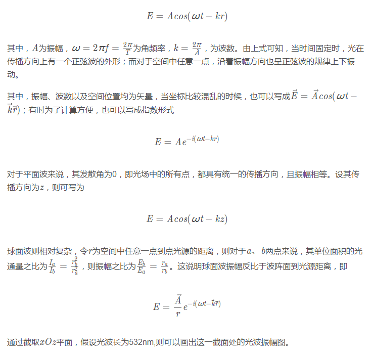 一般來說,三個(gè)特征可以確定空間中的波場:頻率、振幅和相位,故光波場可表示為: