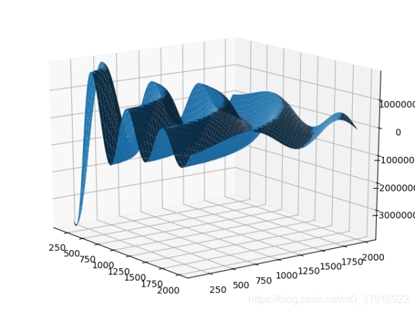 import numpy as np import matplotlib.pyplot as plt from mpl_toolkits.mplot3d import Axes3D z = np.arange(15,200)*10 #單位為nm x = np.arange(15,200)*10 x,z = np.meshgrid(x,z)#創(chuàng)建坐標(biāo)系 E = 1/np.sqrt(x**2+z**2)*np.cos(2*np.pi*np.sqrt(x**2+z**2)/(532*1e-9)) fig = plt.figure() ax = Axes3D(fig) ax.plot_surface(x,z,E) plt.show()