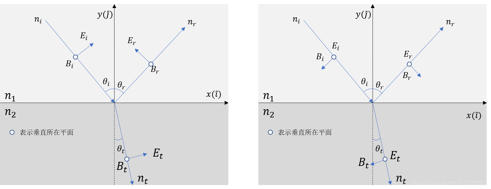由于光是一群橫波的集合,故可以根據(jù)其電矢量的震動(dòng)方向,將其分為平行入射面與垂直入射面的兩個(gè)分量,分別用p分量和 s 分量來表示。一束光在兩介質(zhì)交界處發(fā)生折射,兩介質(zhì)折射率分別為 n1和 n2,對于 p光來說,其電矢量平行于入射面,其磁矢量則垂直于入射面,即只有s分量;而對于 s光來說,則恰恰相反,如圖所示。