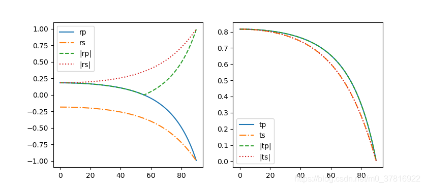 我們可以通過python繪制出當(dāng)入射光的角度不同時(shí),其振幅反射率和透過率的變化