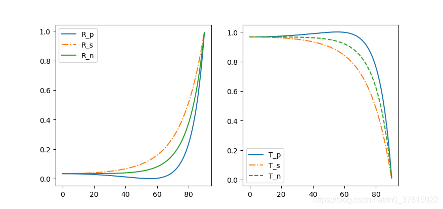 def testFres(n1=1,n2=1.45): theta = np.arange(0,90,0.1)+0j a = theta*np.pi/180 rp,rs,tp,ts = fml.fresnel(theta,n1,n2) Rp = np.abs(rp)**2 Rs = np.abs(rs)**2 Rn = (Rp+Rs)/2 Tp = n2*np.sqrt(1-(n1/n2*np.sin(a))**2)/(n1*np.cos(a))*np.abs(tp)**2 Ts = n2*np.sqrt(1-(n1/n2*np.sin(a))**2)/(n1*np.cos(a))*np.abs(ts)**2 Tn = (Tp+Ts)/2 fig = plt.figure(2) plt.subplot(1,2,1) plt.plot(theta,Rp,'-',label='R_p') plt.plot(theta,Rs,'-.',label='R_s') plt.plot(theta,Rn,'-',label='R_n') plt.legend() plt.subplot(1,2,2) plt.plot(theta,Tp,'-',label='T_p') plt.plot(theta,Ts,'-.',label='T_s') plt.plot(theta,Tn,'--',label='T_n') plt.legend() plt.show()
