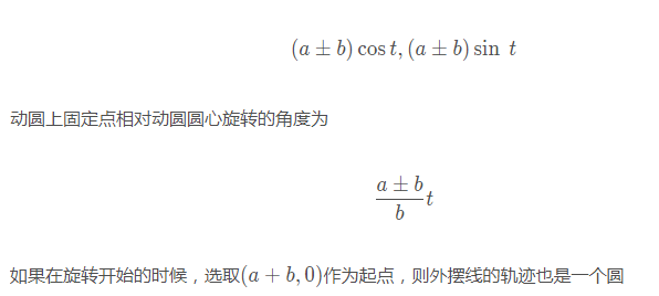 如果在一個(gè)圓繞著另一個(gè)固定的圓滾動(dòng),如果在圓外滾動(dòng),則動(dòng)圓上的某相對(duì)固定點(diǎn)的軌跡為外擺線;若在圓內(nèi)滾動(dòng),則某點(diǎn)的軌跡為內(nèi)擺線。設(shè)定圓半徑為 a ,動(dòng)圓半徑為 b ,則繞行旋轉(zhuǎn) t度后,動(dòng)圓圓心圓心位置為