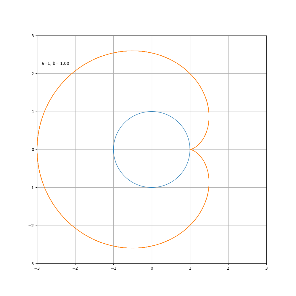 對(duì) a\b進(jìn)行約分得到 m\ n,曲線由m支組成,總共繞定圓 n周,然后閉合。觀察 1 \b = 1 \2 時(shí)的曲線,可以看到其前 p i 個(gè)值和后 π 個(gè)值組成的心形更好看。