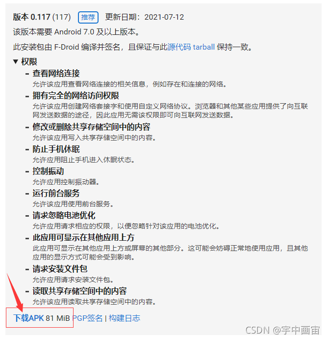 點擊箭頭所指的標志,進入頁面,往下劃到下載版本,直接下最新版本,不推薦下載F-Droid: