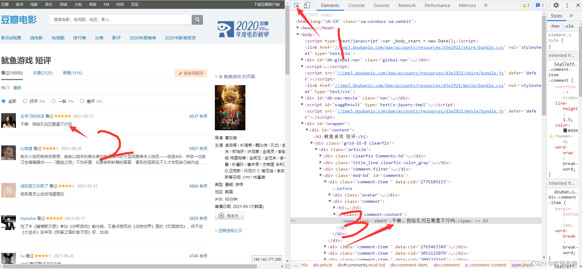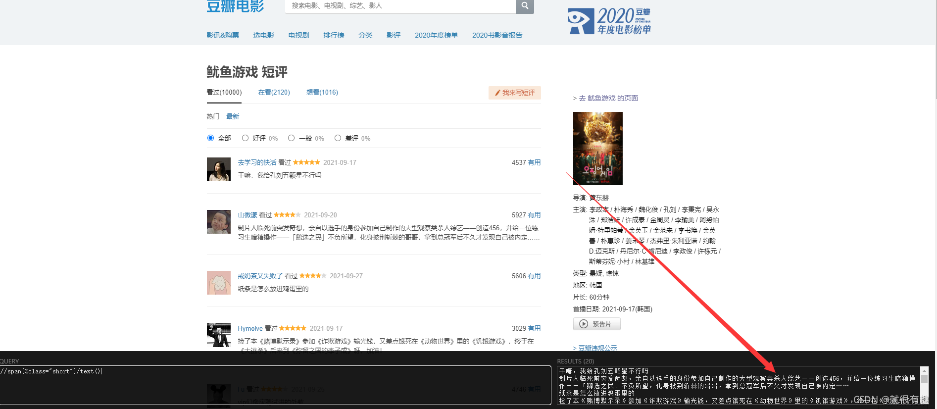 魷魚(yú)游戲是什么,相信大家都不陌生了,雖然說(shuō)博主沒(méi)看過(guò)這部劇,但是還是對(duì)豆瓣的評(píng)論有點(diǎn)好奇,剛剛好近期學(xué)習(xí)了selenium,就當(dāng)練練手了,來(lái)吧來(lái)吧,爬爬爬。