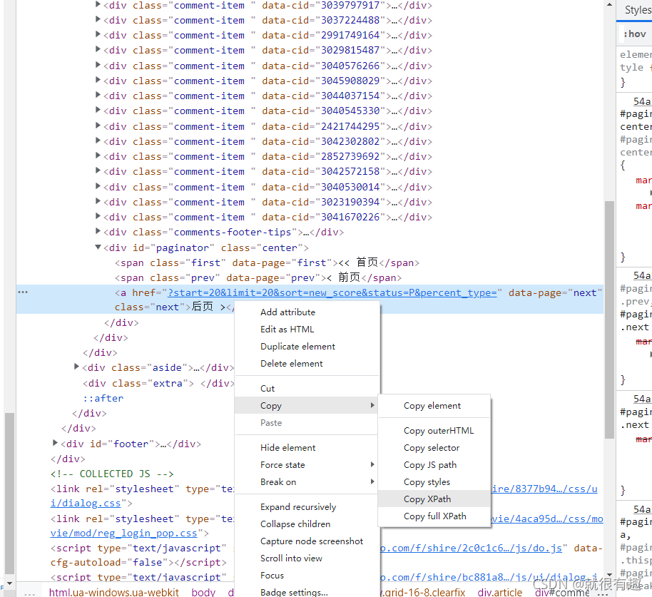 有一個(gè)小技巧,不需要我們自己寫xpath,直接用google瀏覽器可以生成xpath,如下圖所示