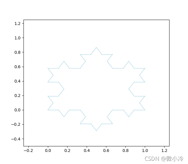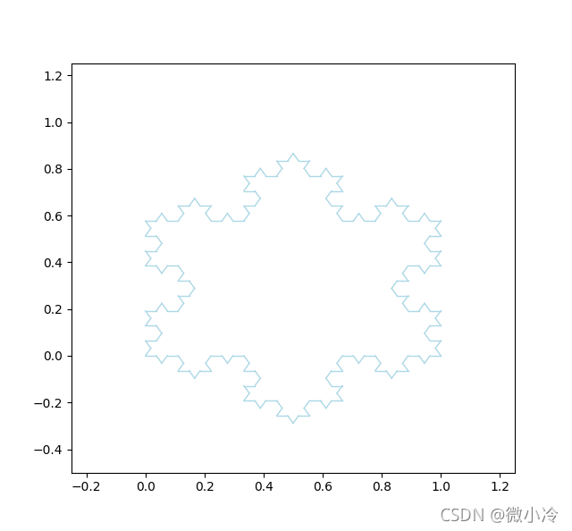 import numpy as np import matplotlib.pyplot as plt from numpy.random import rand,randint # n>=1,生成科赫雪花的方法 def Koch(L,n=1): if n<1 : return newL = [] #(x,y)的列表 for i in range(len(L)-1): delta = (L[i+1]-L[i])/3 x = (L[i][0]+L[i+1][0])/2-np.sqrt(3)/2*delta[1] y = (L[i][1]+L[i+1][1])/2+np.sqrt(3)/2*delta[0] newL += [L[i],L[i]+delta,np.array([x,y]),L[i]+delta*2] newL.append(L[-1]) return newL if n==1 else Koch(newL,n-1) L0 = [ np.array([0,0]), np.array([0.5,np.sqrt(3)/2]), np.array([1,0]), np.array([0,0]) ] def plot_Koch(L): for i in range(len(L)-1): p = np.array(L[i:i+2]).T plt.plot(p[0],p[1],color='lightblue',lw = 1) plt.xlim(-0.25,1.25) plt.ylim(-0.5,1.25) plt.show() if __name__ == "__main__": plot_Koch(Koch(L0,3))