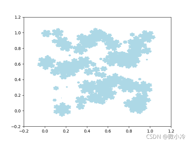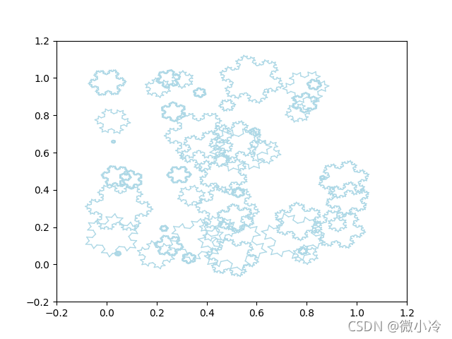 #n為雪花數(shù)量,low,high為最低和最高koch雪花階數(shù) def RandKoch(n,low,high): randKochs = [] rMax = np.sqrt(1/n) for _ in range(n): cx,cy,t0 = rand(3) r = rand()*rMax L0 = [np.array([np.cos(t),np.sin(t)])*r+[cx,cy] for t in (t0-np.arange(4)*np.pi*2/3)] randKochs.append(Koch(L0,randint(low,high))) return randKochs def plot_Kochs(Ls): for L in Ls: for i in range(len(L)-1): p = np.array(L[i:i+2]).T plt.plot(p[0],p[1],color='lightblue',lw = 1) plt.xlim(-0.2,1.2) plt.ylim(-0.2,1.2) plt.show()