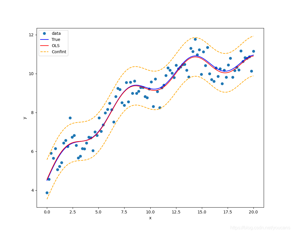 需要注意的是,statsmodels.OLS 的回歸模型沒有常數(shù)項,其形式為:
