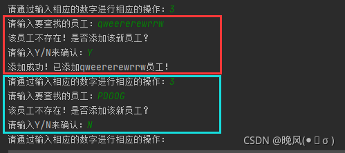 測(cè)試查找功能,查找指定員工信息:若要查找的員工不在,可另外添加至系統(tǒng)中,也可選擇不添加,則會(huì)跳出本次循環(huán)。