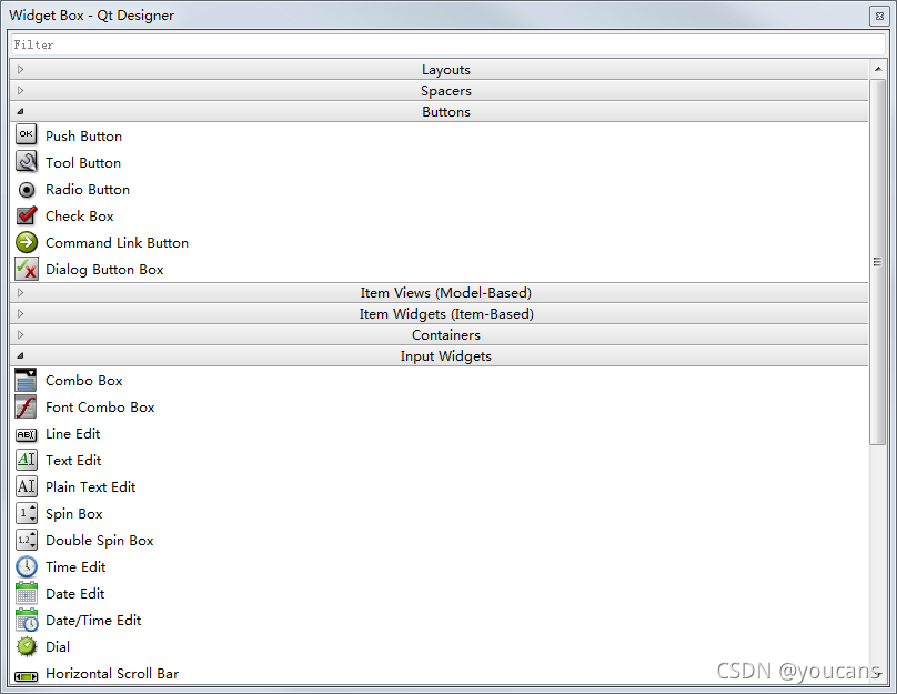 在 QtDesigner 左側(cè)的 “WidgetBox” 工具欄中的"Input Widget" 組,設(shè)有多種不同類型的輸入控件,例如: