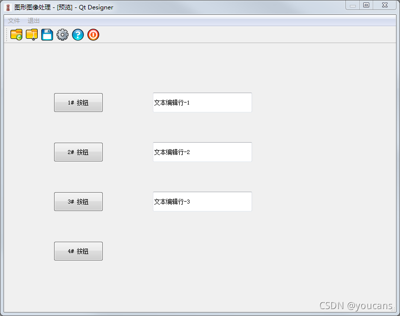 為了便于講解,本例將各 PushButton 控件的顯示內(nèi)容(text 屬性)修改為:“1# 按鈕” ~ “4# 按鈕”,將各 LineEdit 控件的顯示內(nèi)容(text 屬性)修改為:“文本編輯行-1” ~ “文本編輯行-3”。