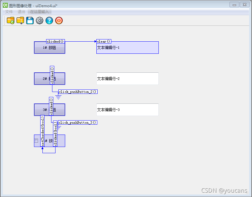 為了方便講解信號(hào)與槽的連接,我們用 QtDesigner 在上節(jié)設(shè)計(jì)的圖形窗口 uiDemo3.ui 的基礎(chǔ)上,增加幾個(gè)按鈕對(duì)象和文本行編輯對(duì)象: